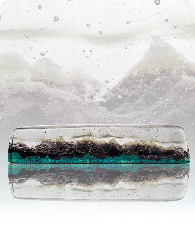 จริงๆ แล้ว เป็นเรื่องปกติที่งานศิลปะที่ทำจากแก้วจะมีฟองอากาศ เนื่องจากเราใช้เทคนิคการหล่อแบบขี้ผึ้ง ซึ่งส่งผลให้เกิดฟองอากาศภายในชิ้นงานโดยธรรมชาติ การที่แสงหักเหผ่านฟองอากาศภายในเหล่านี้แสดงให้เห็นถึงเสน่ห์อันเป็นเอกลักษณ์ของวัสดุแก้ว แสดงให้เห็นอย่างสวยงามว่าแก้วทำหน้าที่เป็นภาชนะสำหรับให้แสงสว่างอย่างแท้จริง