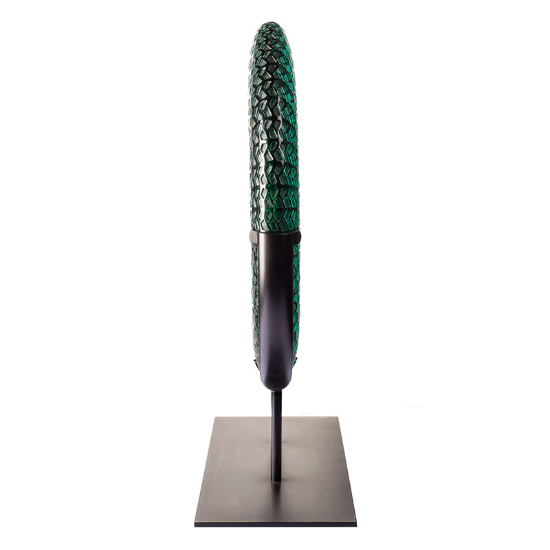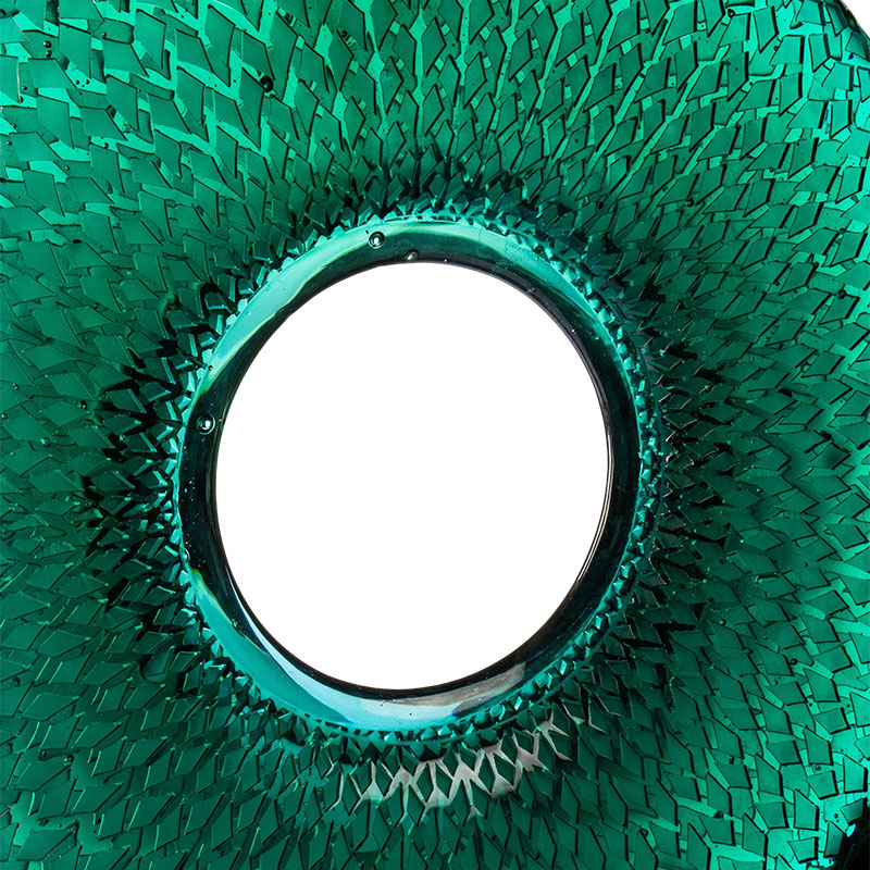 ผลงานชิ้นนี้ใช้ใบไผ่เป็นแรงบันดาลใจตามธรรมชาติ โดยถ่ายทอดจิตวิญญาณอันบริสุทธิ์ของต้นไผ่เขียวขจีที่พลิ้วไหวตามสายลมในป่า ผ่านความโปร่งแสงของกระจก มันสะท้อนภาพสะท้อนของไม้ไผ่นับพันที่ส่องแสงระยิบระยับ สีฟ้าเขียวขจีนั้นสื่อถึงความสดชื่นของป่าไผ่ก่อนที่น้ำค้างยามเช้าจะระเหยไป และความสง่างามแห่งกาลเวลาที่ผ่านไป รูปแบบที่สลับซับซ้อน เช่น เส้นใบไผ่ที่คลี่ออก ระลอกคลื่นเป็นชั้นๆ ขณะที่มันร่ายรำไปทั่วพื้นผิว จับภาพจิตวิญญาณแห่งขุนเขาอันป่าเถื่อนภายในกรอบทรงกลม