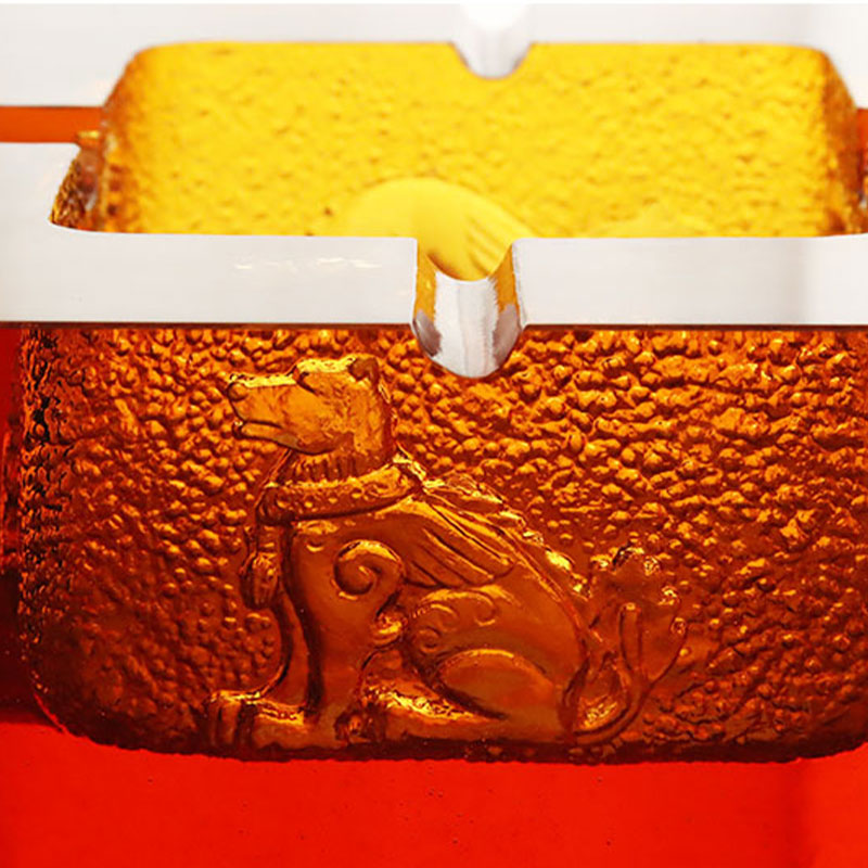 กระจกสีนั้นมีลักษณะของความใสและสีสันของคริสตัลและที่เขี่ยบุหรี่นี้แสดงให้เห็นถึงข้อดีของกระจกสีเหล่านี้อย่างพึงปรารถนา ใช้สีแดงสดเป็นสีหลัก ทำให้ผู้คนรู้สึกอบอุ่นและมีพลัง ในขณะเดียวกัน สีแดงก็ดูสะดุดตาเช่นกัน เมื่อมองจากรูปทรงแล้ว ที่เขี่ยบุหรี่รุ่นนี้มีดีไซน์ที่เป็นเอกลักษณ์เฉพาะตัว โดยมีลวดลายนูนอันวิจิตรงดงามบนพื้นผิว ซึ่งอาจเป็นลายมังกรแบบดั้งเดิม หรือลายมงคลอื่นๆ ทุกรายละเอียดถูกถ่ายทอดออกมาอย่างละเอียด แสดงให้เห็นถึงทักษะอันยอดเยี่ยมของช่างฝีมือ โดยรวมแล้ว ที่เขี่ยบุหรี่แก้วสีนี้ไม่เพียงแต่ให้ความเพลิดเพลินในการมองเห็นเท่านั้น แต่ยังเป็นการผสมผสานระหว่างงานฝีมือและศิลปะที่น่าพึงพอใจอีกด้วย มันรวบรวมการทำงานหนักและภูมิปัญญาของผู้สร้าง และมีมูลค่าการสะสมและมูลค่าการตกแต่งที่สูง ไม่ว่าจะวางไว้ในห้องนั่งเล่นหรือห้องอ่านหนังสือ ที่เขี่ยบุหรี่กระจกสีนี้ก็กลายเป็นจุดเด่นในพื้นที่ได้