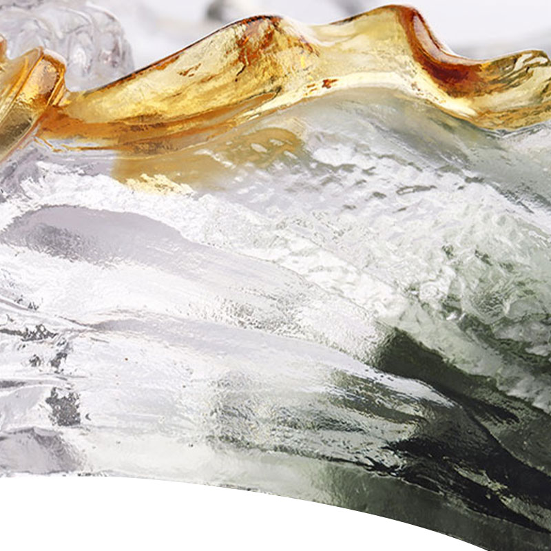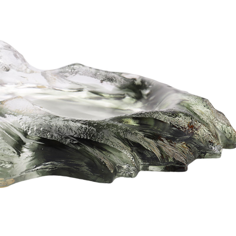 จานผลไม้แก้วนี้ประดิษฐ์ขึ้นอย่างพิถีพิถันโดยใช้วิธีขี้ผึ้งหายแบบโบราณ จานผลไม้มีรูปร่างเป็นจานวงรี โดยมีภูเขาสีเขียวเข้มเป็นลูกคลื่นก่อตัวเป็นแผ่น สีของมันเข้มและเงียบสงบ ราวกับว่ามันควบแน่นความลึกและความลึกลับของภูเขาและป่าไม้