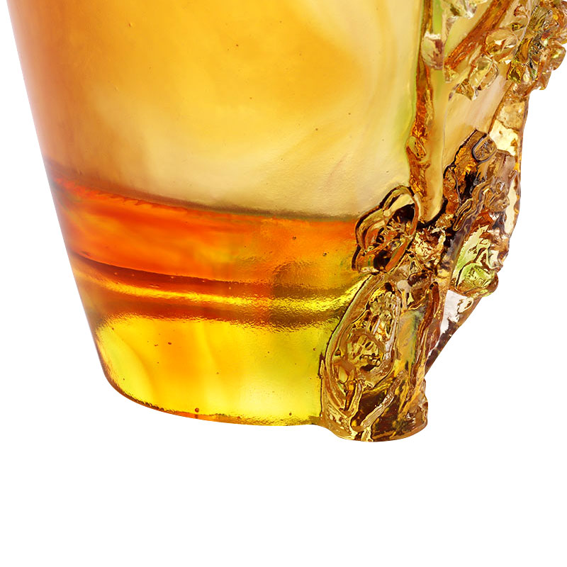 แจกันแก้วในภาพสวยจริงๆ แจกันมีสีทองอบอุ่น และขวดแกะสลักด้วยลวดลายดอกไม้อันงดงาม ซึ่งดูละเอียดอ่อนและมีศิลปะมาก พื้นผิวของตัวแก้วเองทำให้งานแกะสลักเหล่านี้ดูเหมือนภาพนูนต่ำนูนสูงที่สดใส ซึ่งแสดงถึงทักษะอันยอดเยี่ยมของช่างฝีมือ